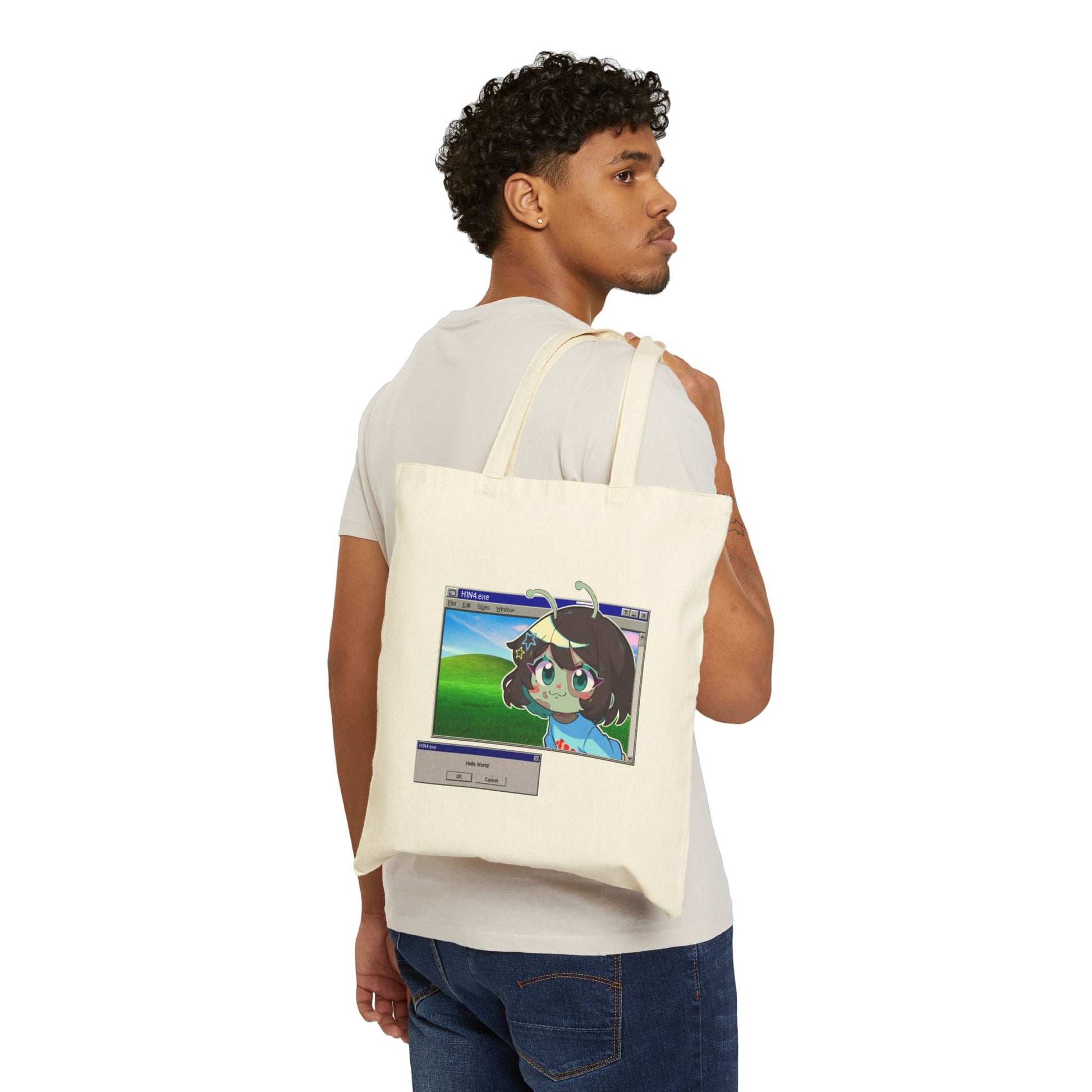 Lightweight, lived-in, and just a little nostalgic — this cotton canvas tote carries a playful spirit wherever you go. The design blends soft anime-style character art with retro computer-window framing on one side and a small, vibrant fish motif on the other. Carry it to art classes, flea markets, or morning coffee runs and let the bag be a quiet conversation starter. The sturdy 12 oz canvas holds sketchbooks, groceries, or a laptop sleeve without sagging. Natural and black colorways keep the look simple, letting the colorful prints pop, while reinforced handles stand up to daily use. It feels like a tiny wearable zine: whimsical, useful, and a bit wistful.